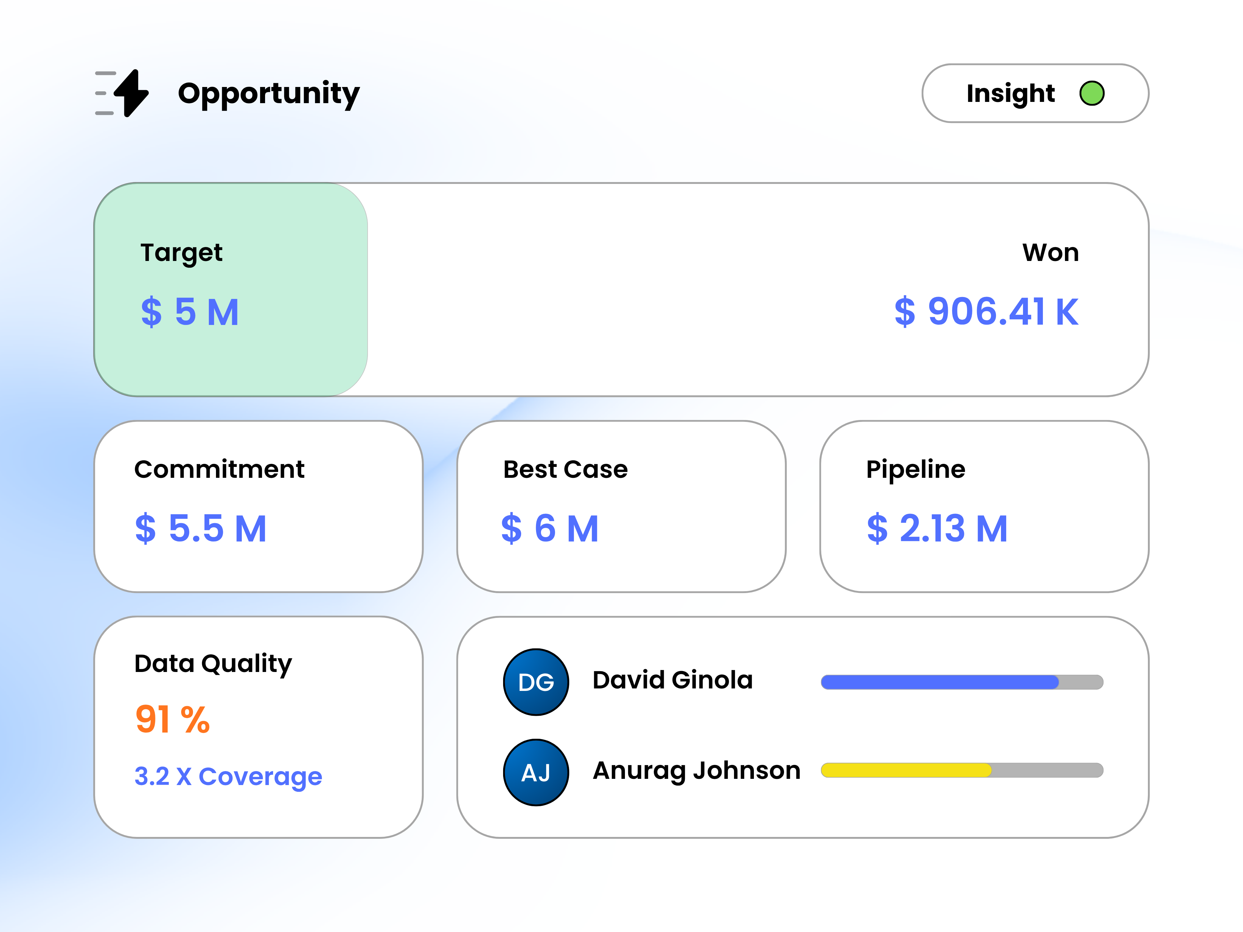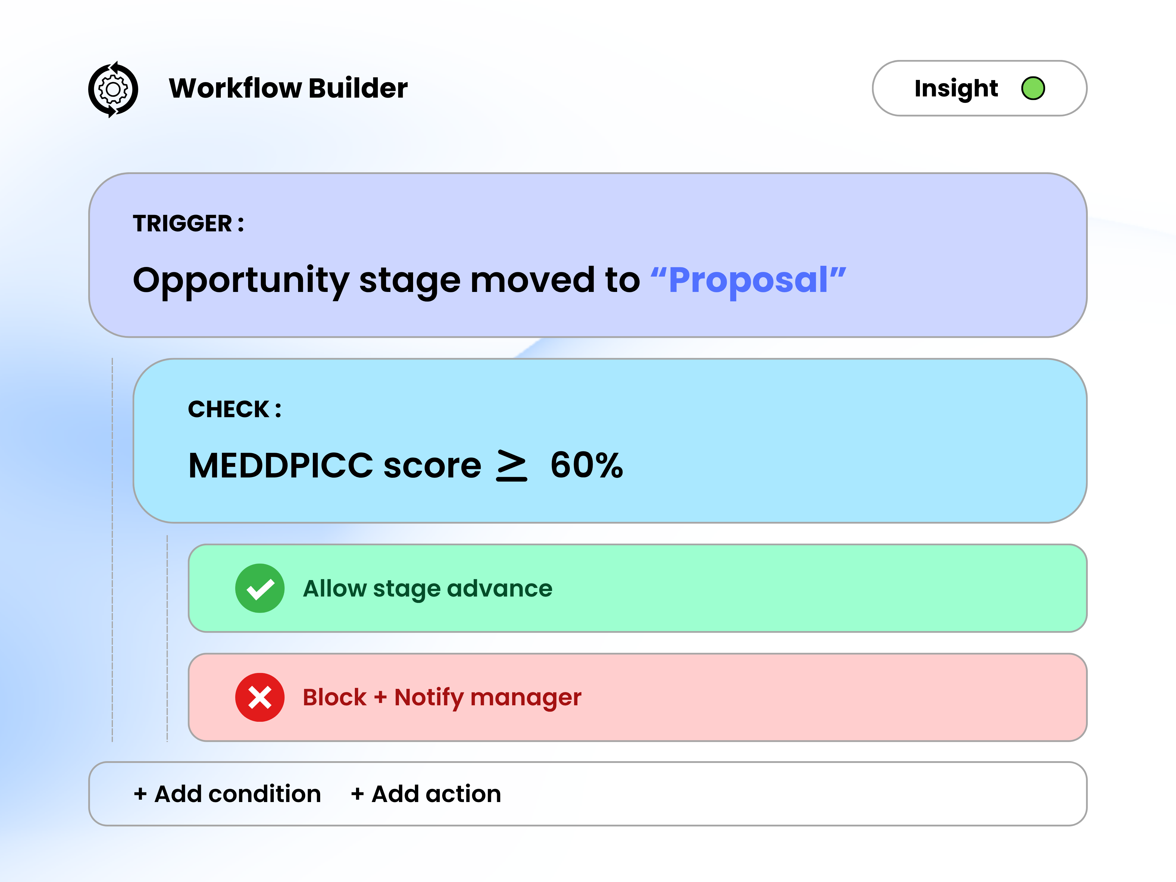 MEDDPICC stage gates, required field validation, and real-time data quality scorecard per rep and manager.